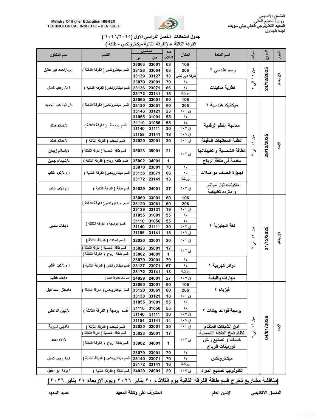جدول امتحانات الفصل الدراسي الاول (2025:2026)
