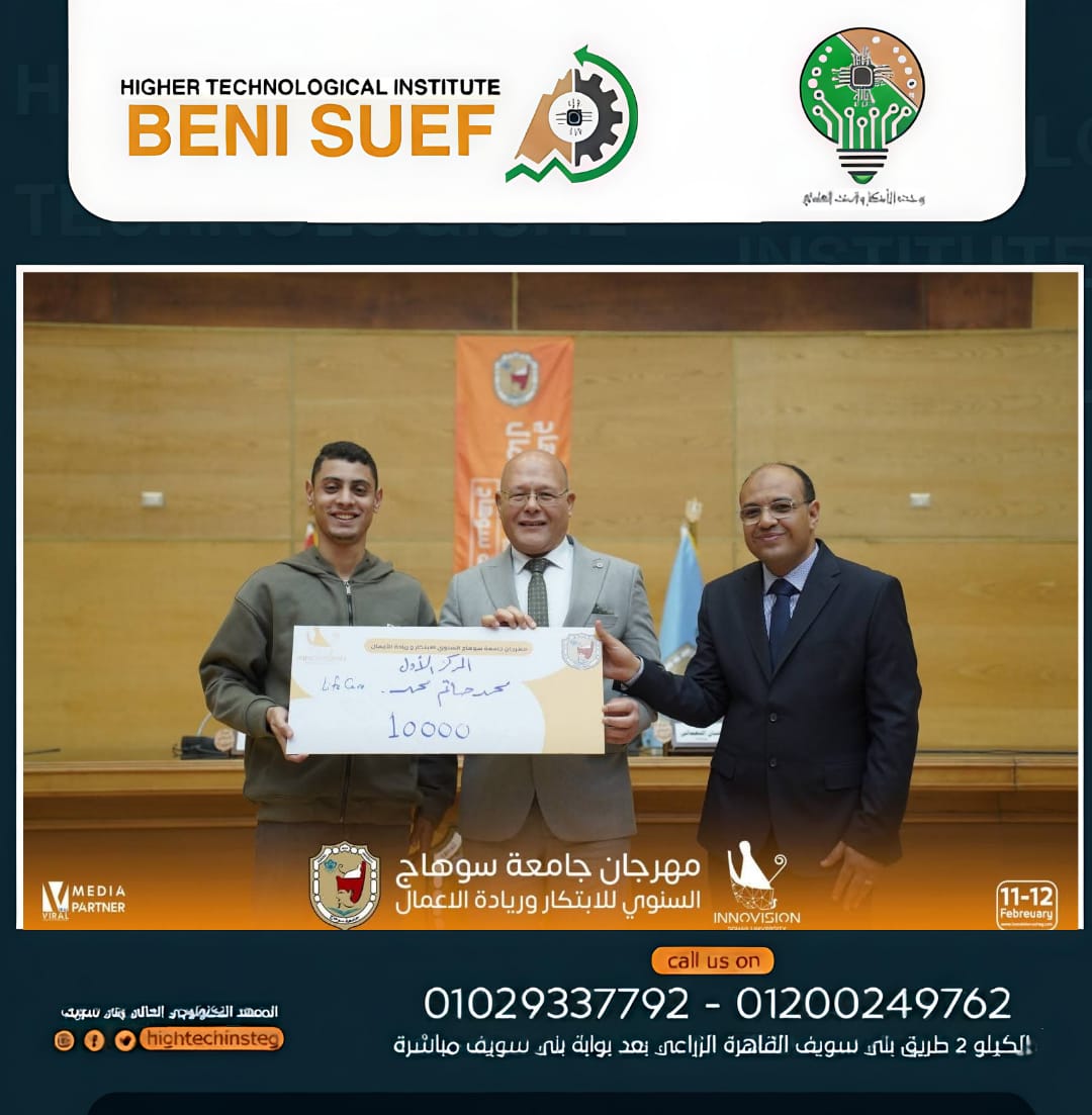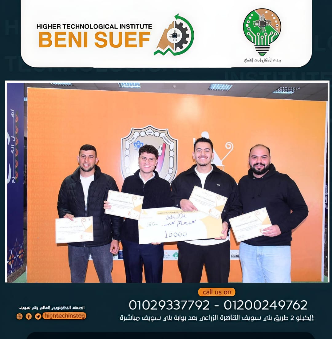 يواصل المعهد التكنولوجي العالي ببني سويف تألقه وتميزه، بحصول فريق متميز من طلابه على ?? المركز الأول في مهرجان الابتكار وريادة الأعمال بـ جامعة سوهاج، تحت إشراف د. نجلاء فايز – مدير وحدة الابتكار والبحث العلمي، والتي تُعد جزءًا أصيلًا من المعهد وداعمًا أساسيًا لمسيرة الإبداع والبحث العلمي به.