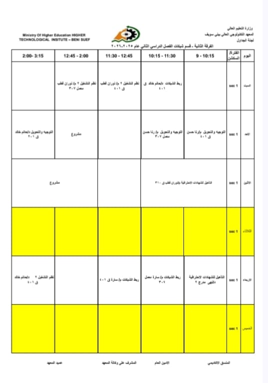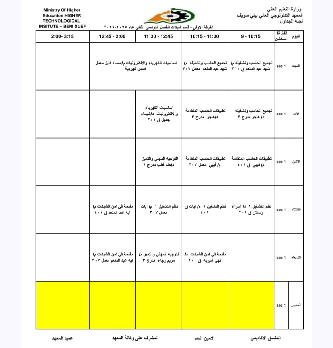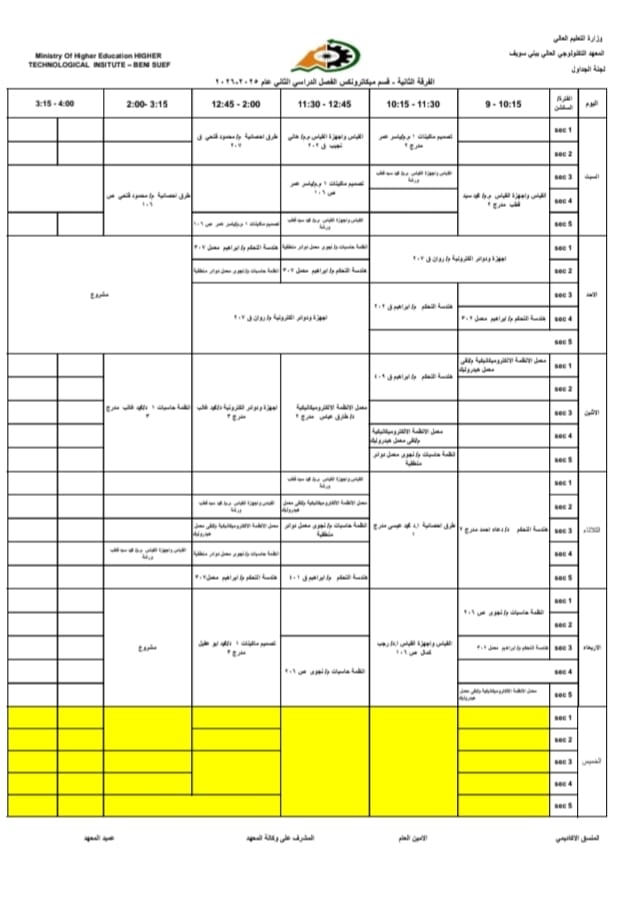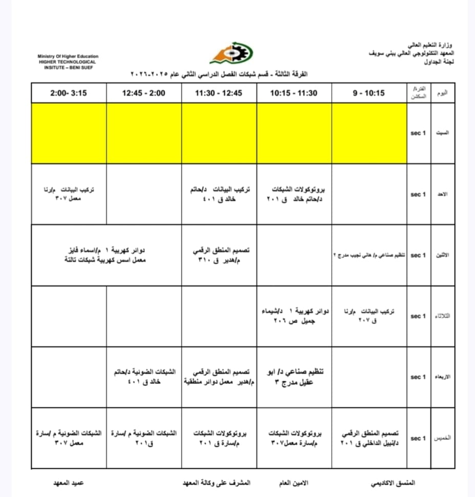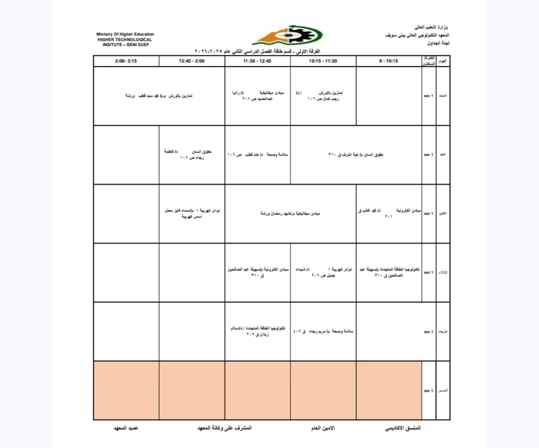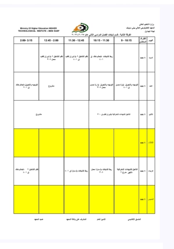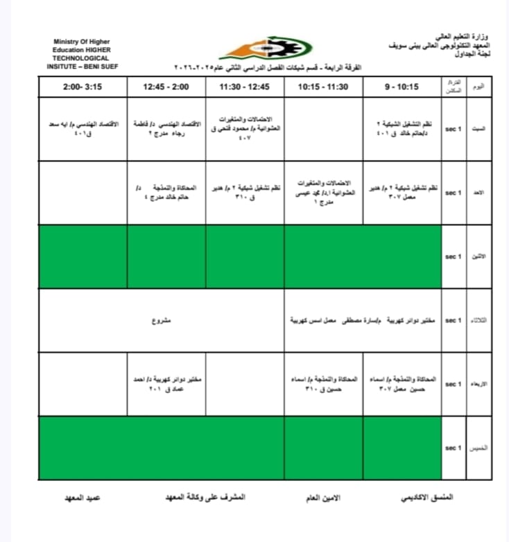 جداول الفصل الدراسي الثاني الخاص بشهر رمضان المبارك – للعام الدراسي 2025/2026 | المعهد التكنولوجي العالي ببني سويف جميع اقسام المعهد تكنولوجيا تشغيل ومراقبة وصيانة شبكات الحاسب. تكنولوجيا إعداد وصيانة وتطوير نظم وبرامج الحاسبات. تكنولوجيا الطاقة الجديدة والمتجددة (شمسية ورياح) برنامج الميكاترونكس طلاب المعهد الكرام، جدول الفصل الدراسي الثاني للعام الجامعي 2025 / 2026 متاح الآن للرجوع إليه والاطلاع على مواعيد المحاضرات والاختبارات. في إطار حرص المعهد التكنولوجي العالي ببني سويف على تنظيم العملية التعليمية وضمان استعداد الطلاب الجيد، يُرجى من جميع الطلاب الاطلاع على الجدول والالتزام بالمواعيد المحددة لكل محاضرة واختبار. نتمنى لكم فصلًا دراسيًا موفقًا ومليئًا بالنجاح والتفوق. #المعهد_التكنولوجي_العالي_بني_سويف #العام_الدراسي_2025_2026 #جدول_الفصل_الدراسي_الثاني #طلاب_المعهد #نجاح_وتفوق #التعليم_في_بني_سويف #استعداد_دراسي #تكنولوجيا_تشغيل_ومراقبة_وصيانة_شبكات_الحاسب #تكنولوجيا_إعداد_وصيانة_وتطوير_نظم_وبرامج_الحاسبات #تكنولوجيا_الطاقة_الجديدة_والمتجددة_شمسية_ورياح #برنامج_الميكاترونكس #جداول_الدراسة #جدول_الترم #جدول_المحاضرات #جدول_السكاشن