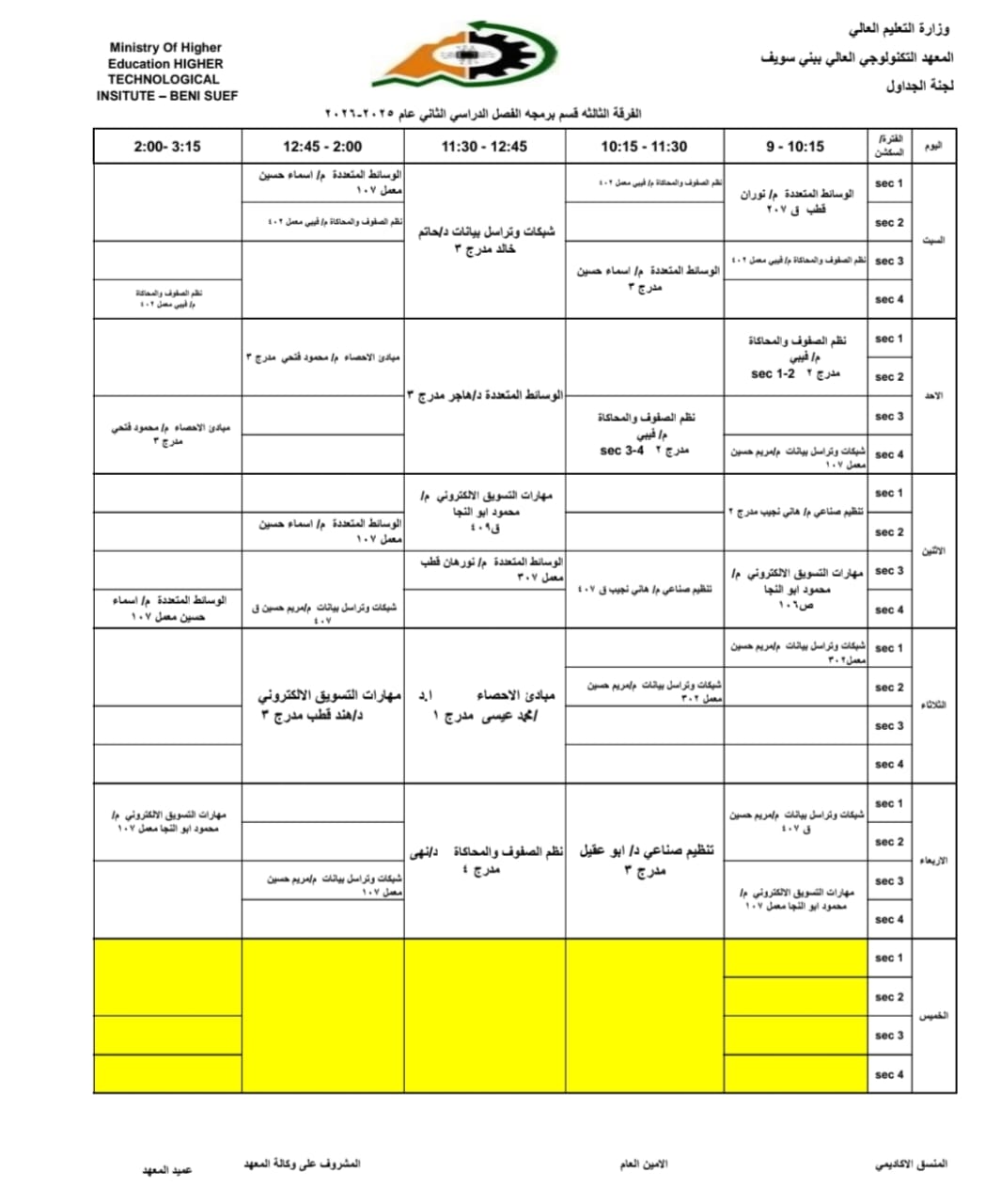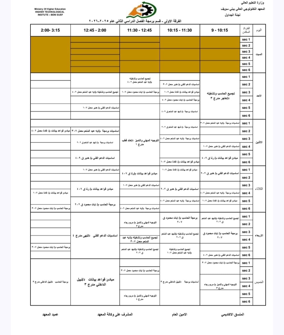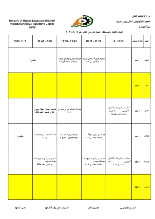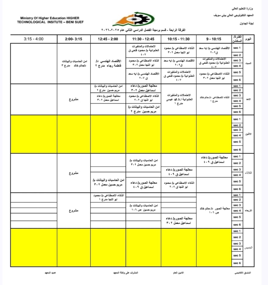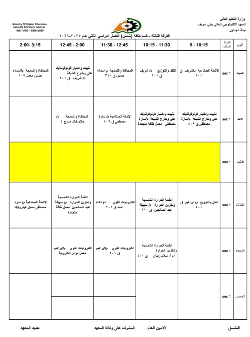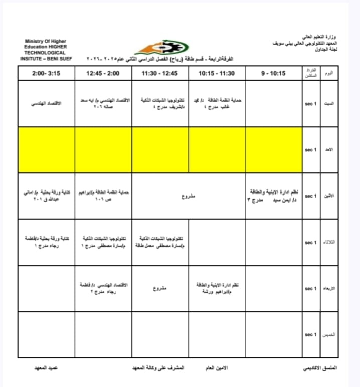 جداول الفصل الدراسي الثاني الخاص بشهر رمضان المبارك – للعام الدراسي 2025/2026 | المعهد التكنولوجي العالي ببني سويف جميع اقسام المعهد تكنولوجيا تشغيل ومراقبة وصيانة شبكات الحاسب. تكنولوجيا إعداد وصيانة وتطوير نظم وبرامج الحاسبات. تكنولوجيا الطاقة الجديدة والمتجددة (شمسية ورياح) برنامج الميكاترونكس طلاب المعهد الكرام، جدول الفصل الدراسي الثاني للعام الجامعي 2025 / 2026 متاح الآن للرجوع إليه والاطلاع على مواعيد المحاضرات والاختبارات. في إطار حرص المعهد التكنولوجي العالي ببني سويف على تنظيم العملية التعليمية وضمان استعداد الطلاب الجيد، يُرجى من جميع الطلاب الاطلاع على الجدول والالتزام بالمواعيد المحددة لكل محاضرة واختبار. نتمنى لكم فصلًا دراسيًا موفقًا ومليئًا بالنجاح والتفوق. #المعهد_التكنولوجي_العالي_بني_سويف #العام_الدراسي_2025_2026 #جدول_الفصل_الدراسي_الثاني #طلاب_المعهد #نجاح_وتفوق #التعليم_في_بني_سويف #استعداد_دراسي #تكنولوجيا_تشغيل_ومراقبة_وصيانة_شبكات_الحاسب #تكنولوجيا_إعداد_وصيانة_وتطوير_نظم_وبرامج_الحاسبات #تكنولوجيا_الطاقة_الجديدة_والمتجددة_شمسية_ورياح #برنامج_الميكاترونكس #جداول_الدراسة #جدول_الترم #جدول_المحاضرات #جدول_السكاشن